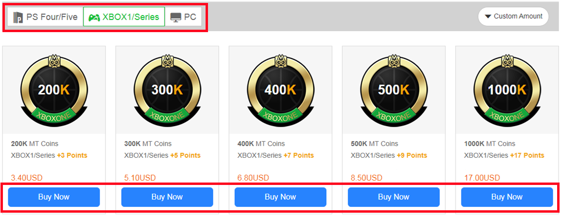 2. Scegli la tua console e il numero di monete MT di cui hai bisogno, quindi fai clic su "Acquista ora".
