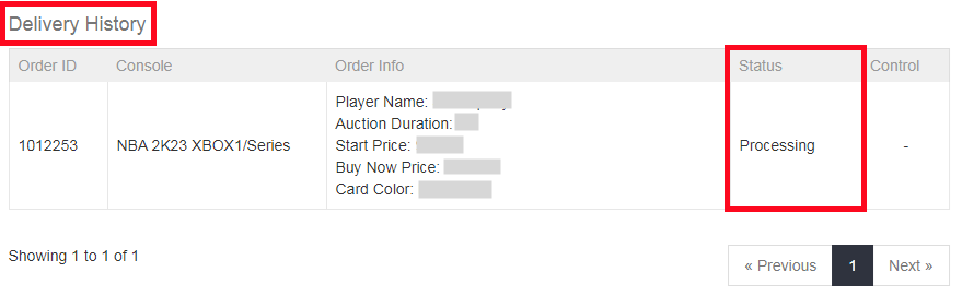 7. Controlla lo stato dell'ordine di ritiro su "Cronologia consegne". Attendi qualche istante finché non acquistiamo la tua carta giocatore, quindi accedi per raccogliere le tue monete.